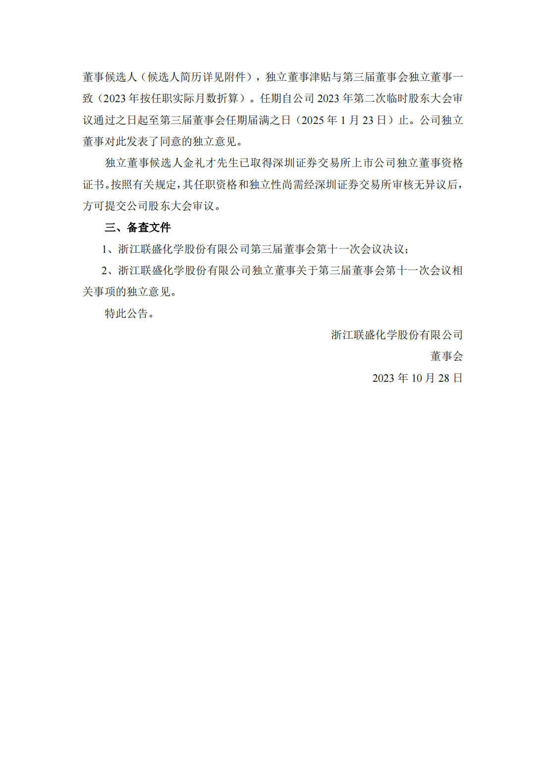 浙江联盛化学股份有限公司 关于独立董事任期届满离任暨补选独立董事的公告