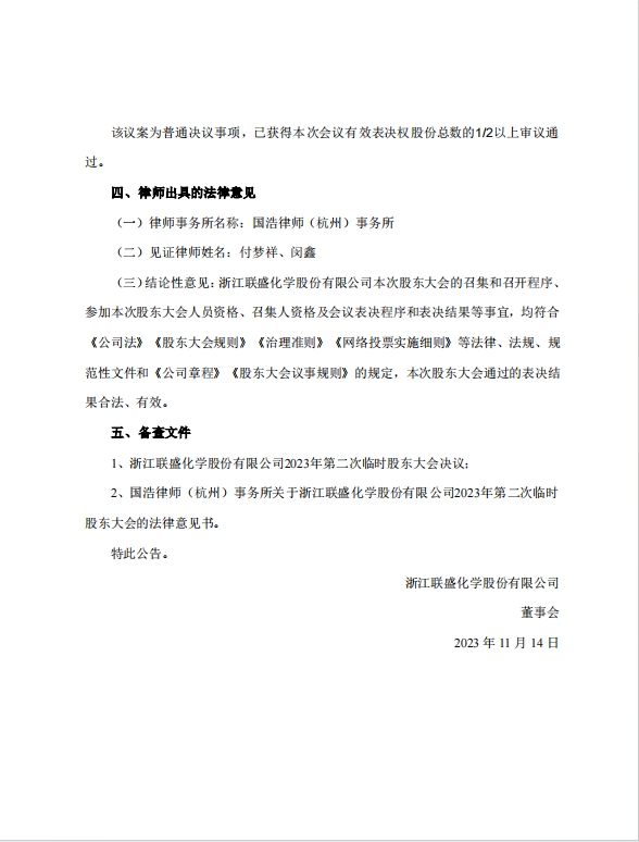浙江联盛化学股份有限公司2023年第二次临时股东大会决议公告